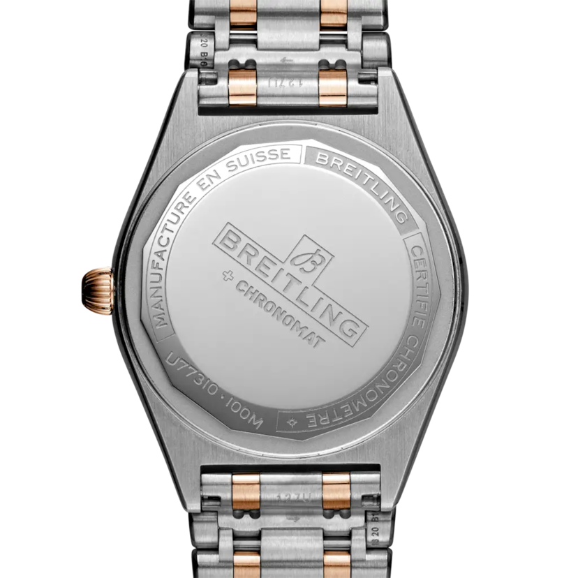 Stylish yet elegant, the modern-retro inspired Chronomat 32 is the versatile sporty and chic watch for any occasion. It is available in an array of metal cases, from cool stainless steel, to goes-with-everything bicolor, or even luxurious 18k red gold. Women craving extra sparkle will also be able to opt for diamond-set bezels, indices, and colorful dials. Featuring Breitling’s iconic and comfortable “Rouleaux” bracelet with a butterfly clasp, the Chronomat 32 is powered by the Breitling Caliber 77, a COSC-certified SuperQuartz™ chronometer.